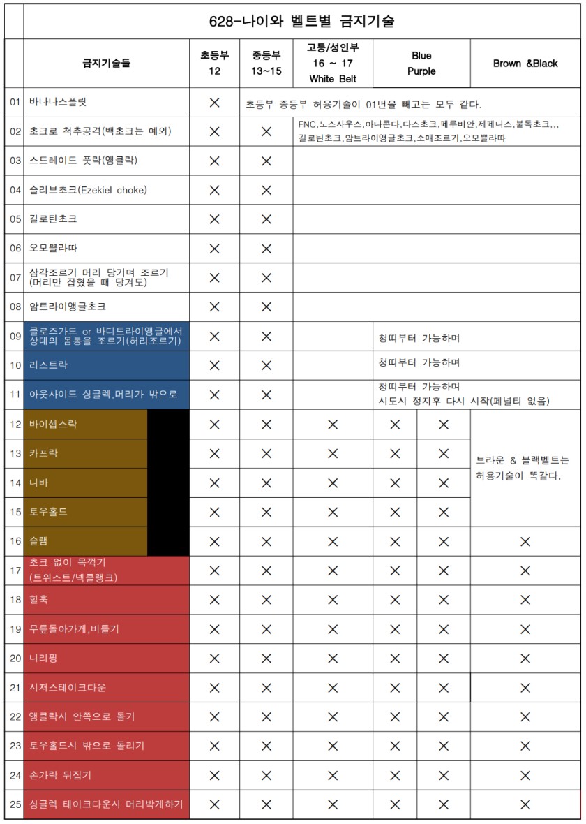 정해 놓은 나이와 벨트별 금지기술을 알아보겠습니다