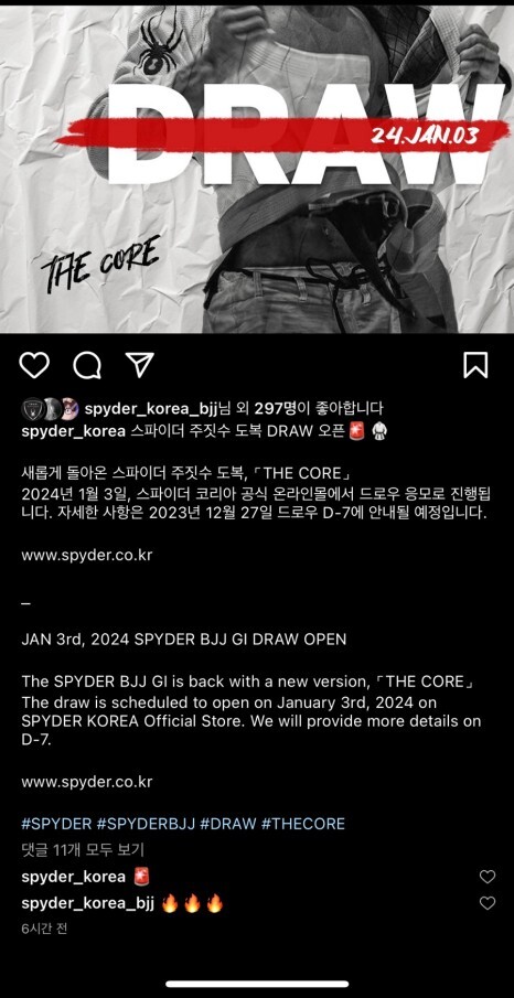 | [주짓수 도복] 스파이더 주짓수 도복 THE CORE 드로우 상세 소식(날짜, 디자인, 가격, 사이즈, 응모 링크,패널티) (0) | 2023.12.27 |