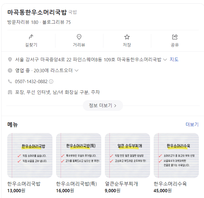 주소 : 서울 강서구 마곡 중앙 4로 22 파인 스퀘어 B동 109호 마곡동 한우소머리국밥