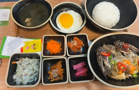구성: 간장게장, 계란프라이, 국, 기본 반찬, 공깃밥 등