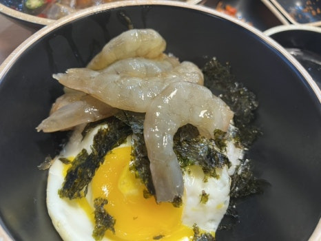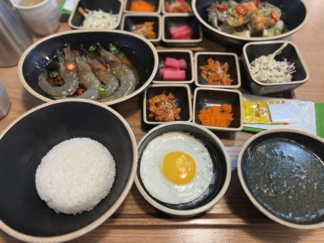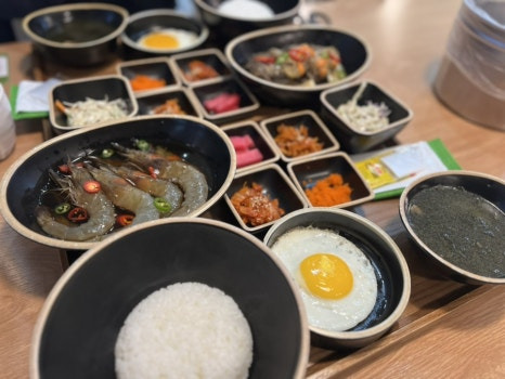 구성: 간장새우장, 계란프라이, 국, 기본 반찬, 공깃밥 등