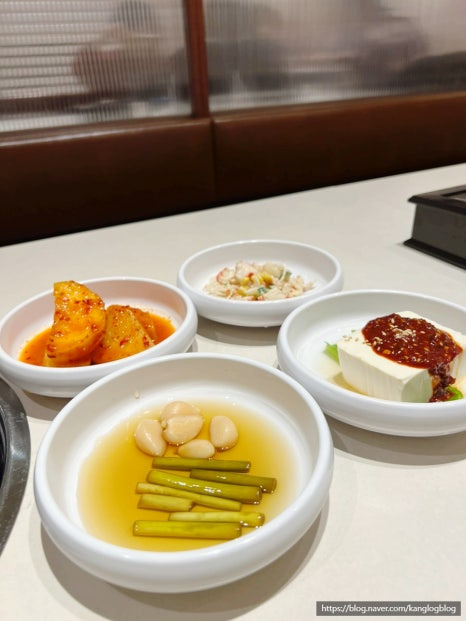 주문을 마치고 나니 기본 반찬들이 세팅되었는데, 하나같이 정갈하고 깔끔해서 젓가락이 멈추질 않았어요. 마늘쫑 장아찌부터 아삭한 깍두기, 달콤한 단호박, 그리고 고소한 콘샐러드까지! 고기 나오기 전부터 반찬으로 배 채울 뻔했습니다. 반찬 하나하나에도 정성이 들어간 게 느껴져서 메인 요리에 대한 기대감이 점점 커졌어요.